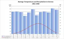 Климат Женевы по классификации Кёппена морской умеренный. Зимы тёплые, обычно с небольшими морозами ночью и оттепелью днём. Лето мягкое. Осадки умеренные и относительно равномерно распределены в течение года, хотя осень более дождливая, чем остальные времена года. Зимой для местностей, находящиеся вблизи Женевского озера, типичны ледяные дожди. Летом многие люди купаются на озере и проводят время на таких общественных пляжах, как Женевский и Бон-де-Паки. В самые холодные месяцы года в Женеве выпадает снег, хотя и не всегда. В близлежащих горах выпадает достаточно снега, чтобы заниматься лыжным спортом. Поездка до всемирно известных горнолыжных курортов Вербье и Кран-Монтана занимает всего два часа на автомобиле. Гора Салев (1400 м), находящиеся на территории Франции, видна с южной стороны из центра города, а Монблан, высочайшая вершина Альп, виден почти с любой точки города. В период 2000—2009 гг. среднегодовое значение температуры было 11 °C, а годовая длительность солнечного света — 2003 часа.
