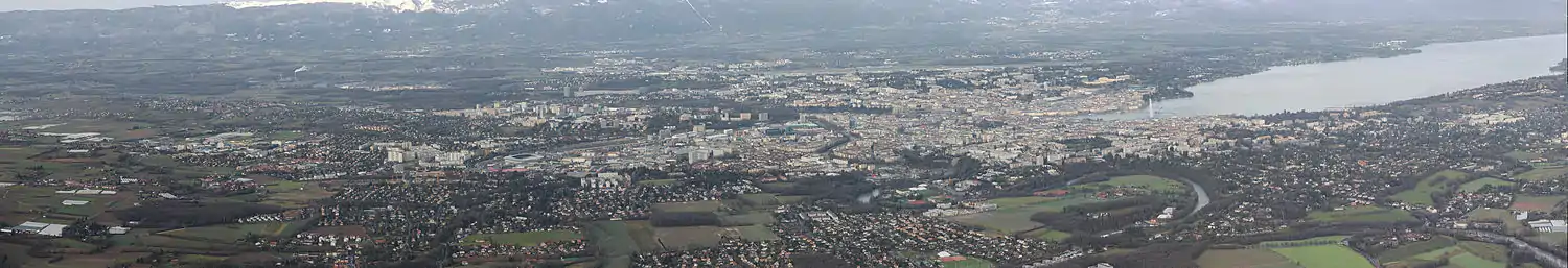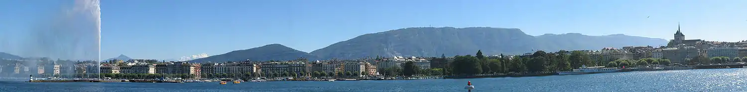 Река Рона делит город на две части. На левом берегу Роны исторический центр с собором Святого Петра и готической ратушей, на правом берегу — Дворец Наций и железнодорожный вокзал. Главная достопримечательность — фонтан высотой 147 метров.