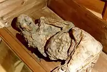 Тело было найдено с ногами, согнутыми за спиной, с почти отрубленной правой рукой. Считается, что рана на руке была получена от лопаты во время раскопок[2]. Кроме этого труп был невредим.