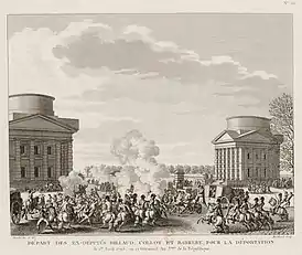 ![]() Попытка освобождения депортируемых бывших депутатов Бийо, Колло и Барера: 1 апреля 1795 года, или 12 жерминаля III года. День Республики, гравюра № 121, Полное собрание исторических картин Французской революции. Жан Дюплесси-Берто, 1802 год | |