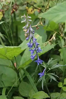 Цветки в простой или ветвистой кисти длинной до 30—33 см. Нижние прицветники цельные, реже разделённые на дольки, но тогда лишь немного превышающие цветонос соцветия, верхние — цельные узколинейные, волосистые. Прицветники линейно-шиловидные, также волосистые, расположенные в верхней четверти опушённой цветоножки. Листки околоцветника сине-голубые, длиной 1,3—1,5 см и 0,45—0,6 см шириной, снаружи коротко прижато-опушённые, верхний из них при основании продолжен в косо вверх восходящий и близ верхушки книзу изогнутый, туповато-заострённый или заострённый шпорец длиной 1,3— 1,8 см и внизу около 3,5— 4 мм толщиной. Нектарники и стаминодии окрашены в тот же цвет, что и листочки околоцветника. Плод —многолистовка.