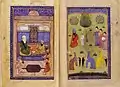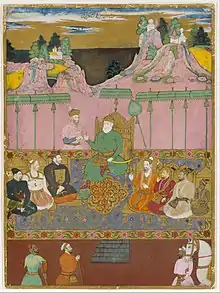 Лохрасп беседует со своим сыном Гоштаспом, "Шахнаме" Фирдоуси, 1438г., Британская Библиотека