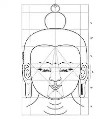 Единицей измерения тела божеств была ладонь, а единицей измерения ладони — «ангула» (размер средней фаланги среднего пальца). Напр. в индийском трактате «Читралакшана» пропорции тела чакравартина измерялись по системе «наватала» (9 ладоней), трактат «Пратимаманалакшана» рекомендовал систему «дашатала» (10 ладоней), 30-я глава комментария Ратнаракшиты на «Самварудайю» для изображения тела Будды предлагала систему «дашатала» (10 ладоней), но с модулем в 12,5 ангула. Тибетские теоретики ввели стабильный модуль — 12,5 ангула для высшей группы в иерархии божеств (система 10 ладоней); 12 ангула — для средней группы божеств (система 10 ладоней) и для всех остальных применявшихся в тибетском искусстве систем в 9, 8, 7, 6, и 5 ладоней.