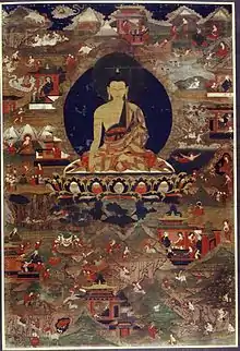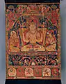 Поскольку буддизм с X—XI веков стал в Тибете доминирующей религией, художники черпали сюжеты из огромного буддийского пантеона. Уникальным источником творчества был образ основателя буддийского учения — Будды Шакьямуни, для изображения которого ещё в Индии была разработана особая иконография. Сюжеты, связанные с ним, можно поделить на три основные категории: эпизоды из его прежних жизней, известные под названием «джатаки»; эпизоды из жизни исторического Будды Шакьямуни; изображение различных небесных или космических будд, которые, как считают верующие, живут во множестве небесных царств за пределами этого мира. Этих последних именуют татхагатами, или Дхьяни-буддами медитации. Пять Дхьяни-будд — Вайрочана, Ратнасамбхава, Амогхасиддхи, Амитаба и Акшобхья, вписаны в сложную систему, в рамках которой каждый из них связан с определёнными буддийскими орденами, цветом, мировой координатой, символическим животным и т. д.