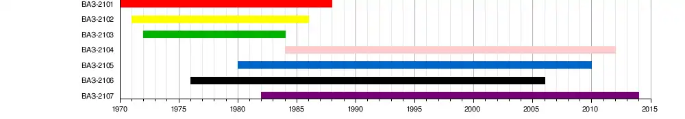 Первые шесть автомобилей ВАЗ-2101 были собраны 19 апреля 1970 года, два из них были окрашены в синий цвет и четыре - в красный, по цветам флага РСФСР. Ритмичная работа главного конвейера началась в августе. Вскоре начался выпуск универсала ВАЗ-2102. С 1972 по 1984 производилась «люксовая» модель ВАЗ-2103. В 1976 году началось производство усовершенствованной модели ВАЗ-2106[2]. Восьмидесятые годы ознаменовались запуском производства моделей с прямоугольным дизайном передней части — ВАЗ-2105, ВАЗ-2104 и ВАЗ-2107[1][3].