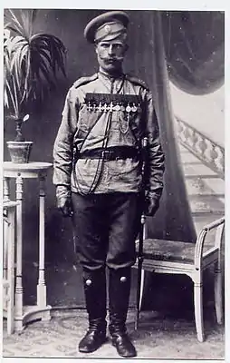 Активный участник Первой мировой войны. В чине подпрапорщика[2] командовал 4-м взводом 2-го эскадрона 9-го Киевского гусарского полка.
