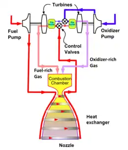 Маршевый двигатель космического челнока RS-25 (SSME) является ещё одним примером ЖРД замкнутой схемы и является первым двигателем данного типа, которые использовали компоненты кислород/водород. Его советским аналогом является РД-0120, использовавшийся в центральном блоке системы РН «Энергия».