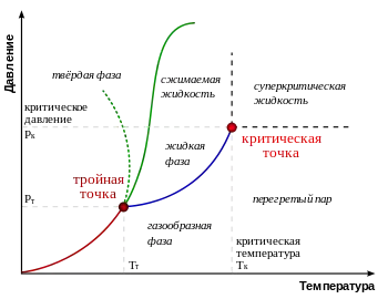 Плавлению (и кристаллизации) соответствует ветвь левее и выше тройной точки, сублимации — ветвь левее и ниже тройной точки. Зелёная пунктирная линия показывает аномальное поведение воды.
