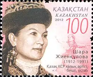- 17 октября 2012 года в честь 100-летия танцовщицы, педагога, Народной артистки КазССР Шары Жиенкуловой издана памятная марка в серии «Памятные, юбилейные даты и праздники».