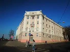 Жилой многоквартирный дом, занимающий угловое положение на выходе радиальной улицы Минина на площадь Минина и Пожарского, построен в 1951—1954 годах по индивидуальному проекту архитекторов Александра Тюпикова и Вадима Воронкова. При строительстве здания был применён контекстуальный подход (высота здания была привязана к примыкающему слева зданию конторы пароходного общества «Волга» начала XX века, а декор подхватывал классицистические мотивы окружающей застройки), благодаря чему строение было аккуратно вписано в существовавший ансамбль главной площади города[1].