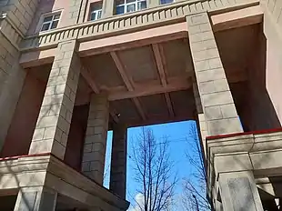 В выделенных пилястрами и рустовкой углах основных объёмов, закреплённых колоннами с квадратным сечением, находятся угловые лоджии в два этажа высотой.