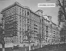 При строительстве использовался труд германских военнопленных, даже большую часть материалов взяли из реквизированных запасов. Согласно некоторым источникам, красные гранитные плиты на фасаде здания были приготовлены по приказу Гитлера для изготовления монумента в честь захвата Москвы. Этот же камень использовался для отделки некоторых зданий на Тверской улице[5][3]. Один из жителей дома вспоминал: