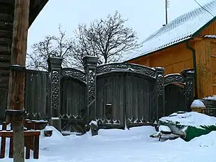 Створы двухпольных ворот надеты со стороны двора на железные кованые крюки. Вереи ворот — брёвна круглого сечения (диаметр — 58 см), стёсанные с уровня земли до квадратного сечения, а уже с 70 см — до сечения в 35 × 35 см.