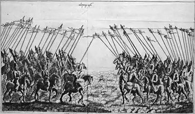 Взору приезжих представилось «блестящее войско… в разноцветном одеянии, со множеством труб и литавр». Младшие придворные — жильцы — составляли «новый, не виданный дотоле отряд воинов. Цвет длинных красных одеяний был на всех одинаков; сидели они верхом на белых конях, а к плечам у них были прилажены крылья, поднимавшиеся над головой и красиво расписанные; в руках — длинные пики, к концу коих было приделано золотое изображение крылатого дракона, вертевшееся на ветру. Отряд казался ангельским легионом. Кто не подивился бы на такое чудное зрелище, того по справедливости я счел бы слепым и среди цветущего сада!»