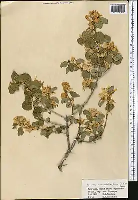 ![]() Жимолость монетолистная, образец из Гербария Московского государственного университета. Киргизия, южный склон Киргизского хребта | ||||||||||||||