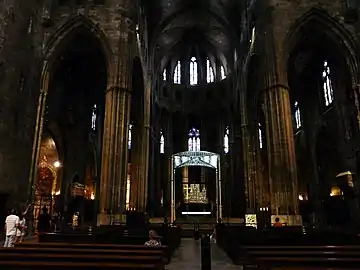 Река Оньяр (кат. Onyar) делит город на две части: на левом берегу расположился современный город, на правом — исторический центр с хорошо сохранившейся средневековой застройкой. Главной достопримечательностью старого города является кафедральный готический собор Жироны (собор Св. Девы Марии, кат. Catedral de Santa Maria), расположенный на Соборной площади (кат. Plaza Catedral); это второй по величине (после собора Св. Петра в Риме) однонефный собор Европы. Построенный в 1416 году Гильеомом Бофилем неф собора (высотой 35 м и шириной 23 м) — самой большой в мире готический соборный неф. Все части собора построены в готическом стиле — за исключением западного фасада, лестница, портал и окно-роза которого являются произведениями каталонского барокко. В соборе примечательны серебряная алтарная преграда, украшенная драгоценными камнями, а также стоящий за алтарём алебастровый трон Карла Великого. При соборе действует музей, среди главных экспонатов которого — тканый ковёр «Сотворение мира» (XI—XII века), статуя короля Педро IV Церемонного (XIV век), копия «Комментария к Апокалипсису» Беата Лиебанского; в музее размещены также скульптуры и фрагменты росписей романского периода[4][5].