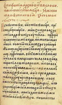 - Мес. тогоже в 8 день, иже во святых отца нашего Епифания Слово на Рожество св. Богородица, о житии ея, и рожестве, и о успении. Л. 62 об. // Рукопись № 664. (404). Минея четья мес. сентябрь, полууст. крупный, ХVІІ века, в лист, 616 л. Фонд 304.I. Главное собрание библиотеки Троице-Сергиевой лавры.