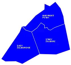 - Нижний Жолибож (Żoliborz Dolny) — между ул. Красинского (Krasińskego), Гвяздзистой (Gwiaździsta), Потоцкой (Potocka) и Мицкевича (Mickiewicza).