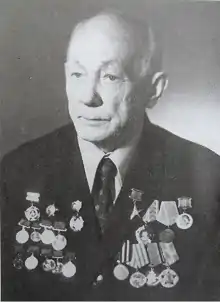 - Орденом Красной Звезды награждён 27 сентября 1944 года за своевременное снабжение необходимыми материалами военных частей в течение трёхлетней службы, что обеспечивало успешное выполнение боевых задач[2].