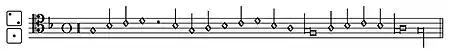 - Первая из них — с подзаголовком «шестого тона» (sexti toni), вторая носит подзаголовок «super voces musicales», то есть по ступеням (воксам) гвидонова натурального гексахорда; Kyrie начинается C-ut, Gloria с D-re и т. д. вплоть до A-la в Agnus Dei.