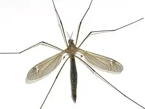 | Хорошо заметные жужжальца позади пары крыльев у комара-долгоножки | Жужжальца перед парой крыльев у веерокрылого |