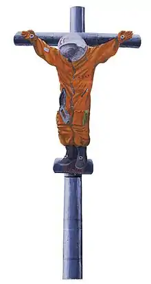 Я бы не хотел называть это скандальным, потому, что мне, наоборот, хотелось в этот праздник, когда совпали и День космонавтики, и Пасха, когда люди радуются, попытаться примирить разные сферы. Туда попали как раз и наука, которую представляет Гагарин, и религия с этим распятием, и ещё в том числе искусство, методами которого я это реализовал.