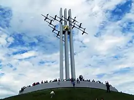 Журавлиный клин из 12 птиц летящих на Запад, где шли бои с врагом, символизирует бессмертие погибших за Родину. Птицы выполнены из нержавеющего металла. Журавлиный клин — это огромная конструкция; система металлических рам, связанных в замкнутый треугольник; длинные консоли и крепёжные детали. На ЭВМ было рассчитано не менее 30 вариантов конструкций журавлиного клина, чтобы он выдержал напряжение и все колебания воздушных потоков. Клюв журавля под напором ветра может колебаться по горизонтали в радиусе до одного метра.