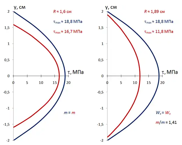 Пример. Приведём распределения касательных напряжений для прямолинейных балок постоянных прямоугольного ( 2 см, 4 см) и круглого поперечных сечения при 10 кН. Красная линия на рисунках соответствует напряжениям в круглом сечении, синяя — в прямоугольном. На левом рисунке сравниваются балки одинаковой массы, на правом — одинакового момента сопротивления изгибу.