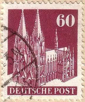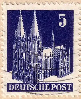 Вышедшая в 1948 году в обращение марка Германии «Кёльнский собор» номиналом в 5 пфеннигов) (Mi #75; Sc #636)