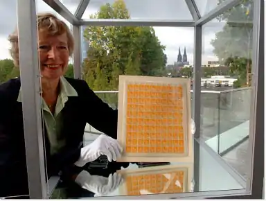 Впервые полностью сохранившийся лист из 100 жёлтых 5-пфенниговых марок был показан на Кёльнской выставке «Philatelia und MünzExpo», которая проходила с 20 по 22 сентября 2007 года; этот лист предоставил Архив филателии (Archiv für Philatelie) при Эндаументе музеев почты и телекоммуникаций в Бонне. Известно, что лист застрахован на один миллион евро и продолжает храниться в боннском архиве.
