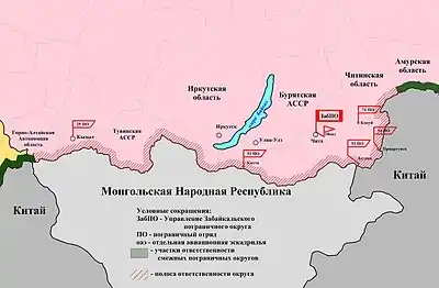 К началу Великой Отечественной войны состав округов НКВД, выполнявших охрану государственной границы от Горного Алтая до Забайкалья, был следующим (отряды указаны в порядке следования с востока на запад)[7][8]: