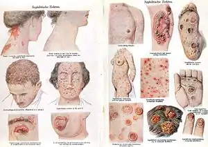 - Си́филис (устар.: люэс) — хроническое системное венерическое инфекционное заболевание с поражением кожи, слизистых оболочек, внутренних органов, костей, нервной системы с последовательной сменой стадий болезни, вызываемое бактериями вида Treponema pallidum (бледная трепонема) подвида pallidum, относящимся к роду трепонем (Treponema) (От др.-греч. τρέπω — поворачиваю, νῆμα — нить) семейства Spirochaetaceae (От др.-греч. σπεῖρα — завиток, χαίτη — длинные волосы)[2].