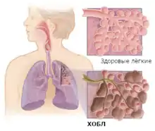 Одной из ведущих причин смертей, связанных с курением, является хроническая обструктивная болезнь лёгких, при которой происходит необратимое и прогрессирующее ограничение вентиляции лёгких[25], при этом против данного заболевания не существует терапий, способных вылечить больного[26], существующие методы лечения способны лишь замедлить прогрессирование заболевания[27]. Курение является причиной примерно 80 % случаев хронической обструктивной болезни лёгких[28]. Пассивное курение также является фактором риска для развития данного заболевания[29]. Раньше данным заболеванием болели в основном мужчины, однако в современном мире им болеют в примерно одинаковой пропорции и мужчины, и женщины, поскольку в странах с высоким уровнем дохода курение получило распространение и среди женщин, а в странах с низким — женщины подвергаются воздействию различных факторов загрязнения воздуха, например, при отоплении помещений дровами, а воздействие загрязнённого воздуха также может приводить к развитию данного заболевания[29].