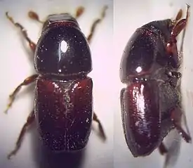 Длина тела взрослых насекомых 3—4,5 мм[1]. Тело красно-бурое, блестящее. Голова и переднеспинка тёмно-бурые, почти чёрные[2].