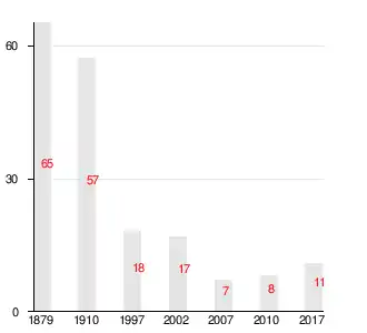 Число жителей по семейным спискам 1879 г.: 31 м. п., 34 ж. п.; по приходским сведениям 1879 г.: 36 м. п., 41 ж. п[3].