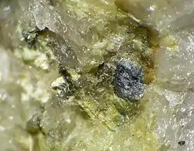 ![]() Кристалл заварицкита серого цвета с полуметаллическим блеском. Поле обзора — 3 мм | |