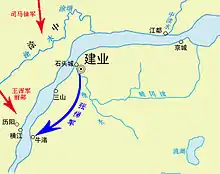 В среднем и нижнем течении Янцзы начиная с середины февраля Ван Хунь захватил Сюньян, Гаован и Лайсян. Сыма Чжоу взял Тучжун и отправил своего подчинённого Лю Хуна поставить под контроль северный берег Янцзы, а Ван Хэну поручил пересечь Янцзы. Армия Ван Хэна разбила войска Цай Цзи, уничтожив в битве свыше 60 тысяч человек.