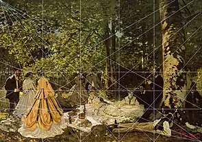 | Приблизительный вид картины «Завтрак на траве»: левый и средний уцелевшие фрагменты в сравнении с утраченными частями полотна[88][89] | |||