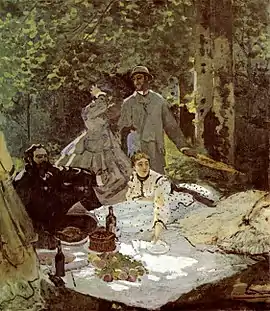 В 1865 году, под впечатлением от одной из своих поездок на этюды в Фонтенбло, Моне задумал написать монументальную картину размерами 4 × 6 м для заявки на Парижский салон 1866 года[5][6]. Он хотел перейти от малых форм к большим[7], и написание такого большого полотна рассматривалось художником как вызов самому себе и вместе с тем представителям общественности, которые с сарказмом раскритиковали его картины на Салоне отверженных ещё в 1863 году[5]. Между тем тремя годами ранее, в 1862 году, Мане создал одноимённую картину (холст, масло, 208 × 264,5 см; Музей Орсе)[8], отвергнутую Салоном 1863 года из-за своей «непристойности»[9]. Появление данной работы на Салоне отверженных эпатировало публику и ознаменовалось скандалом из-за изображения обнажённых женщин в группе одетых людей, среди которых было можно узнать достаточно известных личностей[10][11]. Моне задумал своё полотно в качестве вызова и одновременно дани Мане, избрав ту же тему, но подойдя к ней с другим стилем, которым тоже хотел удивить зрителя, но уже с другой стороны[12][10][13]. Как и ранее Жерико, Моне в тот момент было только 25 лет, когда он решился на создание работы, которая была бы в три раза больше, чем «Завтрак» Мане, и в два раза шире, чем «Завтрак на охоте» Курбе[14] (холст, масло, 207 × 325 см; Музей Вальрафа-Рихарца)[15]. Задав моду на живописание пикников, Мане не терпел того, когда его сравнивали и ставили рядом с Моне, «этим выскочкой из Гавра»[16]. Между тем картины Мане и Моне часто путали, вследствие чего последнему приходилось подписывать свои работы, в том числе и «Завтрак на траве», не просто фамилией, но также и именем[4][17]. Впоследствии они стали друзьями[18].