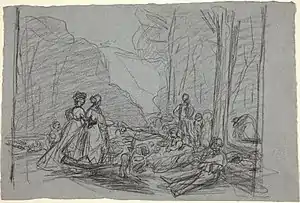 Работа над картиной началась весной 1865 года[5]: с апреля по октябрь Моне с одной целью — написать сцену пикника с множеством фигур — пробыл в Шайи[19], на окраине леса Фонтенбло[20], своеобразной студии импрессионистов[21]. Проведя несколько месяцев в ожидании Базиля, модели и одного из героев будущего полотна, Моне создал ряд пейзажных этюдов, варьирующихся от маленьких эскизов до больших набросков[22]. Из них можно выделить несколько отдельных произведений пейзажного искусства, которые сам Моне считал значительными среди остальных своих работ[19]: «Дорога на Шайи через лес Фонтенбло» (холст, масло, 97 × 130,5 см; Музей Ордрупгаард)[23], «Дорога на Шайи» (холст, масло, 43 × 59 см; Музей Орсе)[24], «Дуб Бодмера, лес Фонтенбло на дороге в Шайи» (холст, масло, 96,2 × 129,2 см; Метрополитен-музей)[25]. Работал он на природе, широко и свободно, достигнув тех тонов, того контраста света и тени, каковых на то время не было ни у Курбе, ни у Мане[22]. Эти эскизы больших деревьев с отбрасывающими тень ветками и листьями, созданные примерно в одних и тех же местах, послужили ландшафтным фоном для будущего «Пикника»[26][27]. Последняя работа особо примечательна тем, что на ней запечатлён дуб Бодмера, названный так в честь швейцарского художника Карла Бодмера, который на Салоне 1852 года выставил работу с изображением данного дерева, после чего оно стало любимцем художников и фотографов, в частности Гюстава Ле Гре[28].