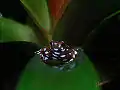 Самцы издают брачные крики, сидя в бромелиевых, повторяя их несколько раз в минуту. Икринки откладываются в прицветники. Самцы переносят головастиков в бассейны бромелиевых.