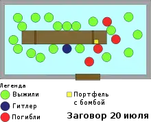 Когда Штауффенберг вошёл, он попросил адъютанта Кейтеля фон Фрейенда дать ему место у стола поближе к Гитлеру, ссылаясь на проблемы со слухом, полученные в результате ранений[32]. Он встал рядом с полковником Брандтом и поставил портфель под стол в паре метров от Гитлера, прислонив его к массивной деревянной тумбе, поддерживавшей стол[33]. После этого под предлогом телефонного разговора Штауффенберг вышел. Брандт пересел ближе к Гитлеру и передвинул мешавший ему портфель по другую сторону тумбы, которая теперь защищала Гитлера[34][35]. Перед отъездом, пока Штауффенберг искал машину, он зашёл к Фельгибелю и они вместе наблюдали взрыв[36]. Затем Штауффенберг, находившийся в уверенности, что Гитлер мёртв, выехал. Он успел покинуть зону оцепления до того, как она была полностью закрыта. На последнем КПП Штауффенберга задержал офицер, но получив от адъютанта коменданта подтверждение, разрешил ехать[37][38].