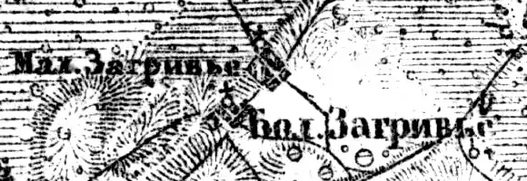 ЗАГРИВЬЯ БОЛЬШАЯ И МАЛАЯ — деревня бывшая владельческая, дворов — 55, жителей — 320; часовня, школа. (1885 год)[7]