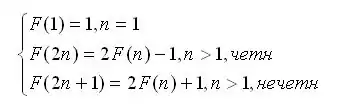 Из чего можно вывести формулу F(2n +1) = 2 F(n) + 1 (для всех n > 1). Сведем все рассмотренные ситуации и запишем все случаи в виде системы, позволяющей определить значение функции F(n) — для любых значений n:
