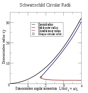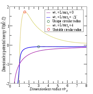 то есть когда две притягивающие силы — Ньютонова гравитация (первый член) и её релятивистская поправка (третий член) — точно сбалансированы отталкивающей центробежной силой (второй член). Существуют два радиуса, на которых достигается эта компенсация