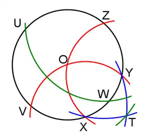Нарисуем дугу с радиусом, равным OT ( радиуса окружности C) и центром в точке Z, она пересечёт окружность C в точках U и W. UVWZ является квадратом, а потому дуги окружности C UV, VW, WZ и ZU равны друг другу и являются четвертинками окружности C.
