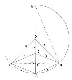 На рисунке справа нарисована окружность радиуса a с центром в точке O. На ней выбрана точка A и построены точки B и B' , находящиеся на расстоянии b от A. Точка A' лежит напротив A, но её строить не нужно (здесь потребовалась бы линейка). Подобным же образом обозначим (воображаемую) точку H на пересечении AA' и BB' . Точку C можно найти из B и B' , если нарисовать окружности радиуса b.