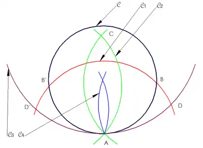 Замечание: Чтобы построение сработало, радиус окружности C1 не должен быть ни слишком маленьким, ни слишком большим. Точнее, этот радиус должен быть где-то между половиной радиуса окружности C и её диаметром. Если радиус больше диаметра C, C1 не пересечётся с C. Если радиус C1 меньше половины радиуса окружности C, точка C окажется между A и O и C3 не пересечётся с C.