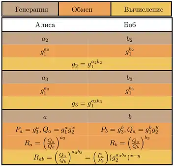 - Алиса выбирает , вычисляет и . Боб выбирает , вычисляет и . Происходит обмен .