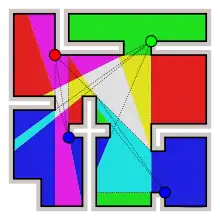 Заметим, что вершины получившегося триангуляционного графа можно раскрасить в три цвета так что каждый треугольник имеет вершины всех трёх цветов. Действительно двойственный граф триангуляции, имеющий по одной вершине для каждого треугольника и по одному ребру для каждой пары смежных треугольников является деревом. Поскольку любой цикл в двойственном графе образовал бы дыру внутри многоугольника, что противоречит условию отсутствия дыр (по условию многоугольник простой). Если в триангуляции существует более одного треугольника, двойственный граф (как и всякое дерево) должен иметь вершину, у которой всего один сосед, что соответствует треугольнику, смежному лишь одному другому треугольнику. Многоугольник с меньшим числом треугольников, полученный путём удаления этого крайнего треугольника, имеет раскраску в три цвета (используем математическую индукцию), так что раскраску легко распространить и на дополнительную вершину удалённого треугольника.